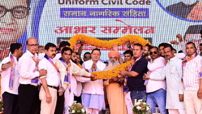 हरिद्वार। मुख्यमंत्री पुष्कर सिंह धामी को उत्तराखंड में समान नागरिक संहिता (यूसीसी) लागू करने के लिए डॉ. बी.आर. अंबेडकर महामंच द्वारा हरिद्वार में आयोजित कार्यक्रम में सम्मानित किया गया। संविधान निर्माता डॉ. भीमराव अंबेडकर की 135वीं जयंती पर हरिद्वार में बी.एच.ई.एल मैदान में यह कार्यक्रम आयोजित किया गया जिसमें कि चिलचिलाती धूप में बड़ी संख्या में स्थानीय जनता की जोशपूर्ण मौजूदगी रही।